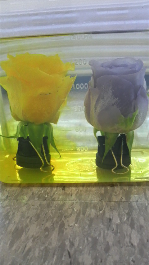 入れてすぐに黄色のバラから色素が抜けてきました。
